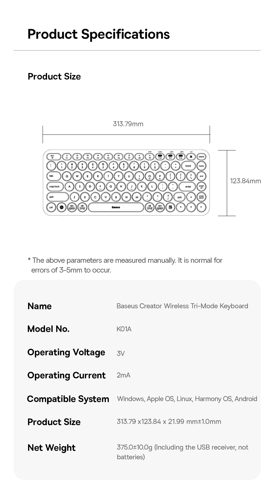 | Tên | Bàn Phím Không Dây Kết Nối 3 Chế Độ OS-Baseus K01 Wireless Tri-Mode Keyboard |