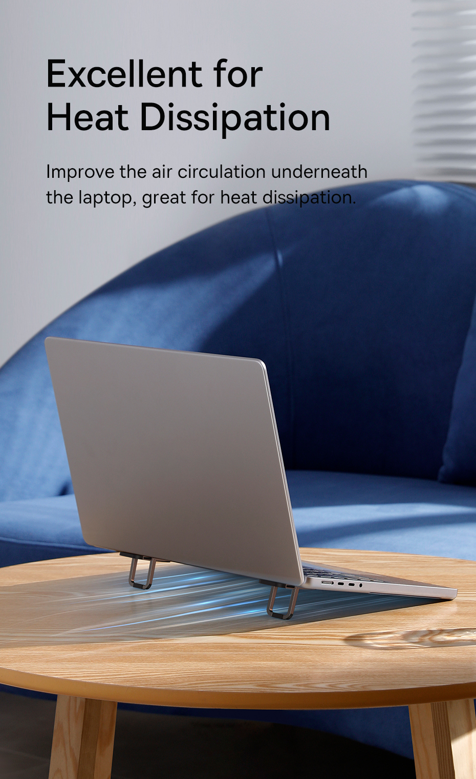 💨 Hỗ Trợ Tản Nhiệt Hiệu Quả: Việc nâng máy lên khỏi mặt bàn tạo ra một không gian thông thoáng bên dưới, giúp không khí lưu thông tốt hơn và cải thiện đáng kể khả năng tản nhiệt của laptop, đặc biệt khi chạy các tác vụ nặng.