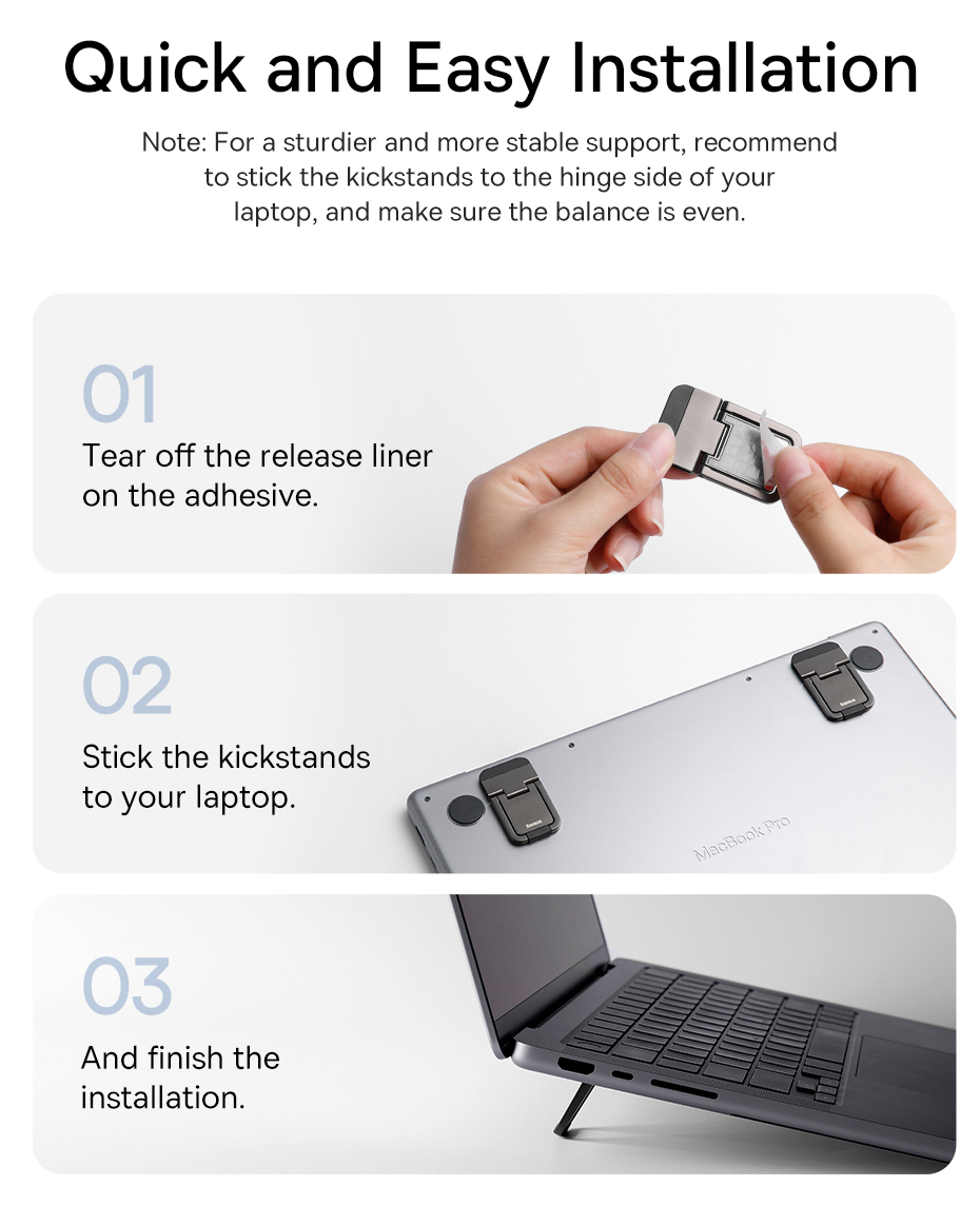 👍 Dễ Dàng Lắp Đặt, Bền Bỉ Chắc Chắn: Được làm từ hợp kim kẽm cao cấp, chịu lực tốt và bền bỉ. Lắp đặt cực kỳ đơn giản bằng lớp keo 3M chuyên dụng, bám dính chắc chắn vào đáy laptop mà không để lại vết keo khi tháo ra.
