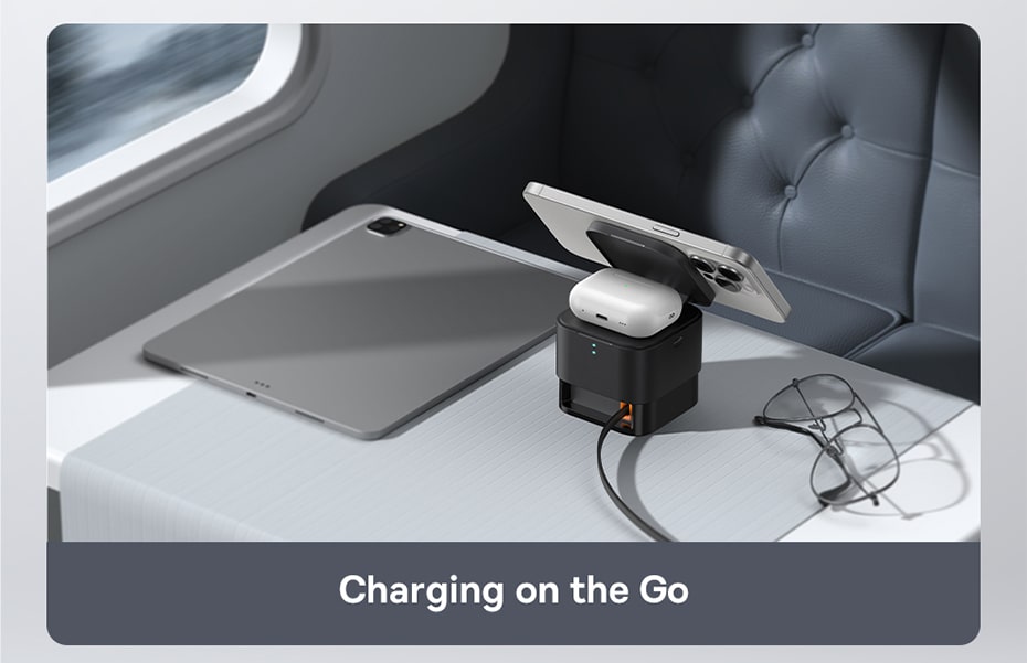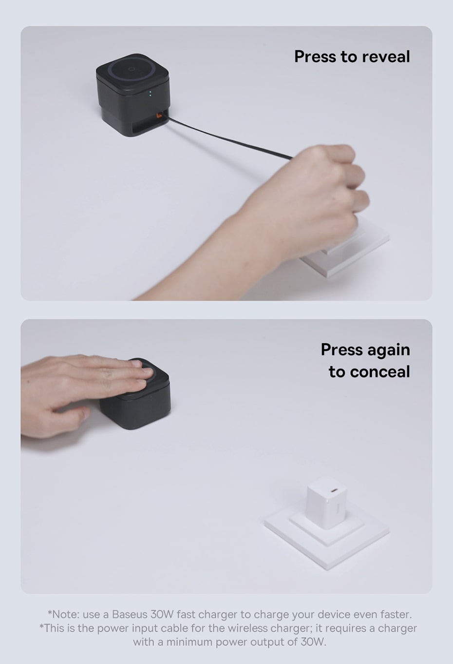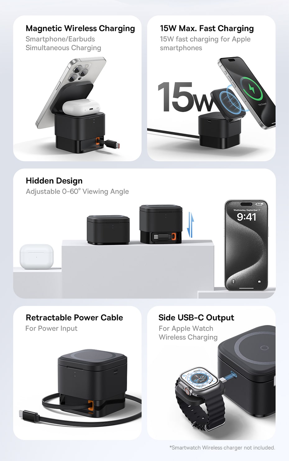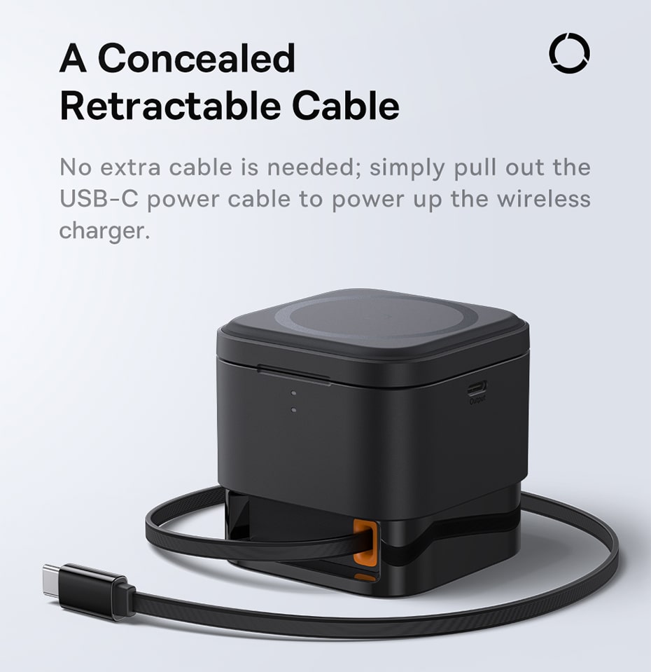 🔗 Tích Hợp Dây Sạc Tự Rút Gọn: Không cần thêm dây cáp! Đế sạc được tích hợp sẵn một sợi cáp Type-C có thể tự rút gọn vào bên trong, giúp bàn làm việc của bạn luôn ngăn nắp và sẵn sàng để di chuyển.