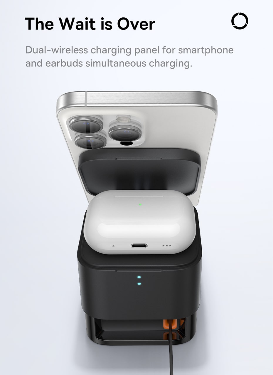 ○ Thiết kế 2 trong 1: Sạc đồng thời điện thoại và tai nghe không dây.