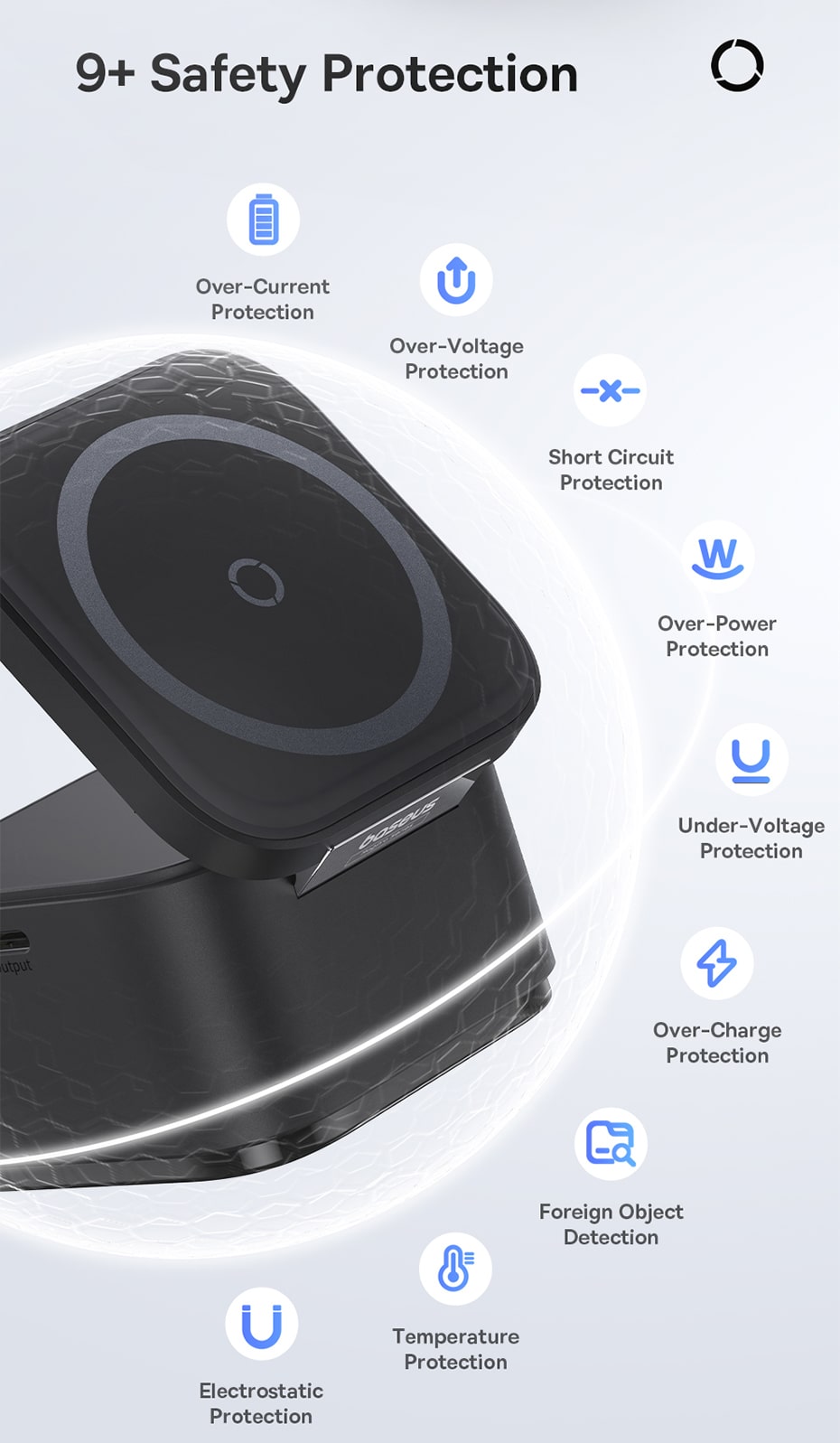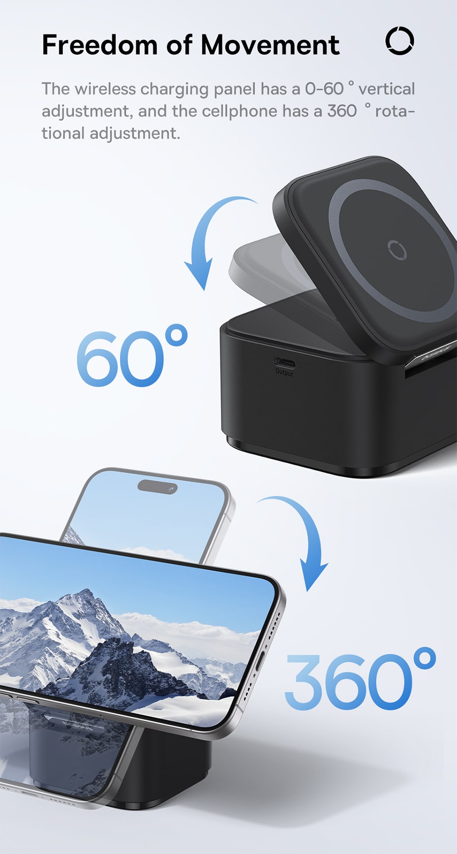 📐 Thiết Kế Giá Đỡ Linh Hoạt: Mặt sạc nam châm có thể nâng lên và điều chỉnh góc độ, biến thiết bị thành một chiếc giá đỡ điện thoại tiện lợi. Hoàn hảo để xem phim, gọi video hay theo dõi thông báo trong khi sạc.