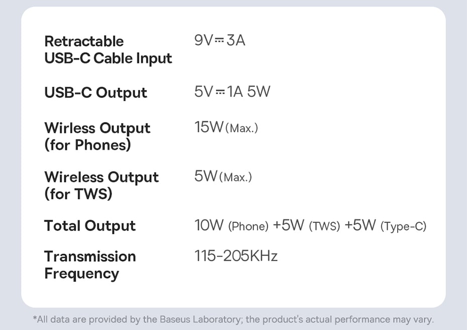 | Total Output | 10W (Điện thoại) + 5W (Tai nghe) + 5W (Cáp Type-C) |