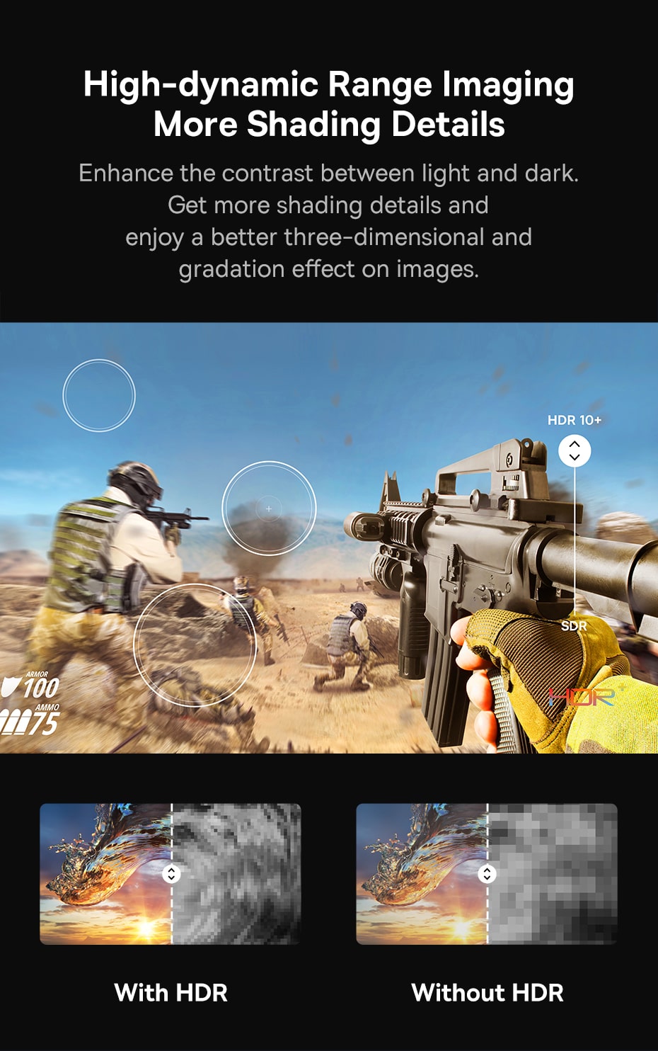Hỗ trợ HDR và 12-bit màu: Mang lại chất lượng hình ảnh với màu sắc và độ tương phản vượt trội.