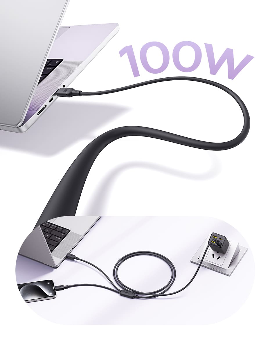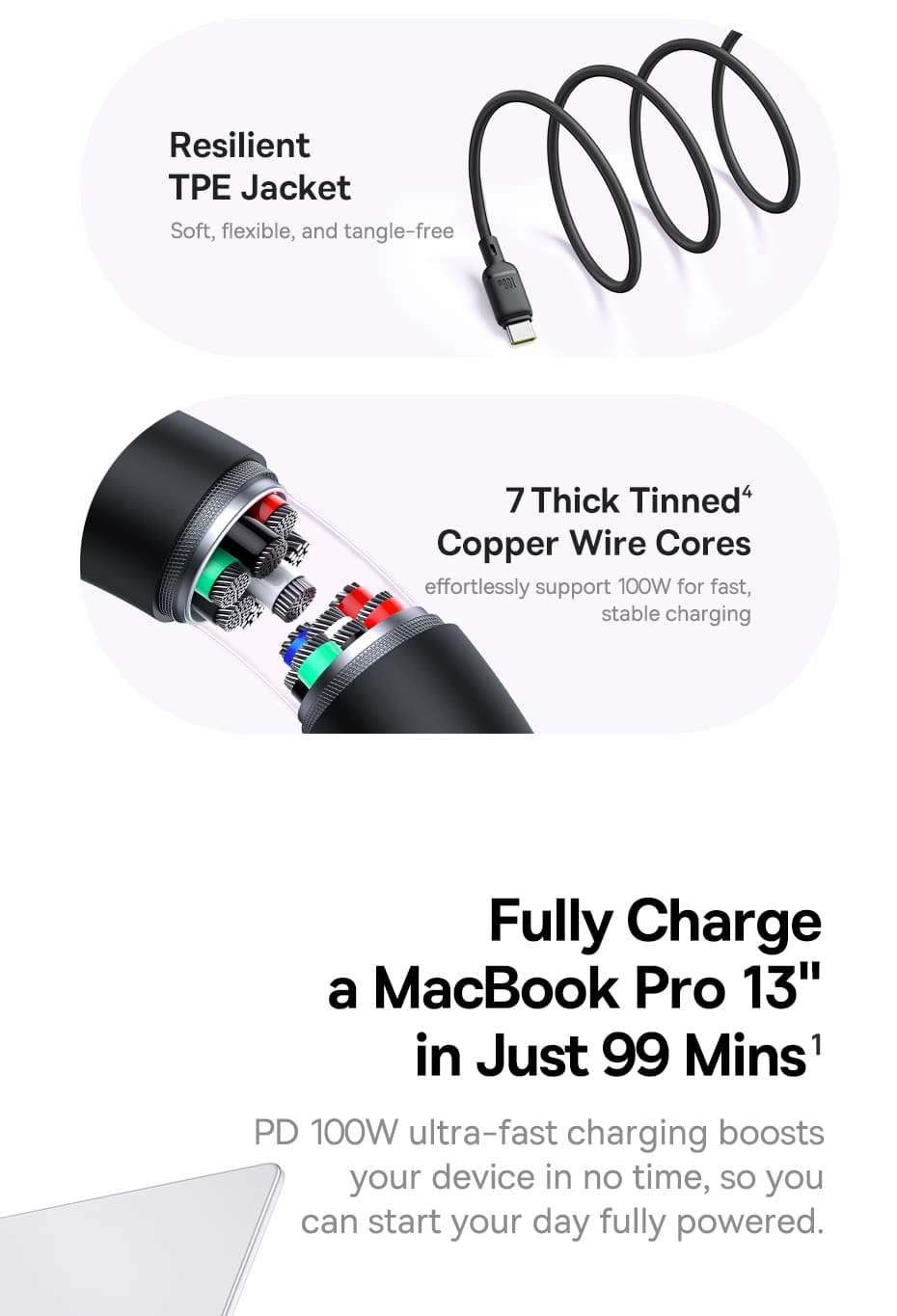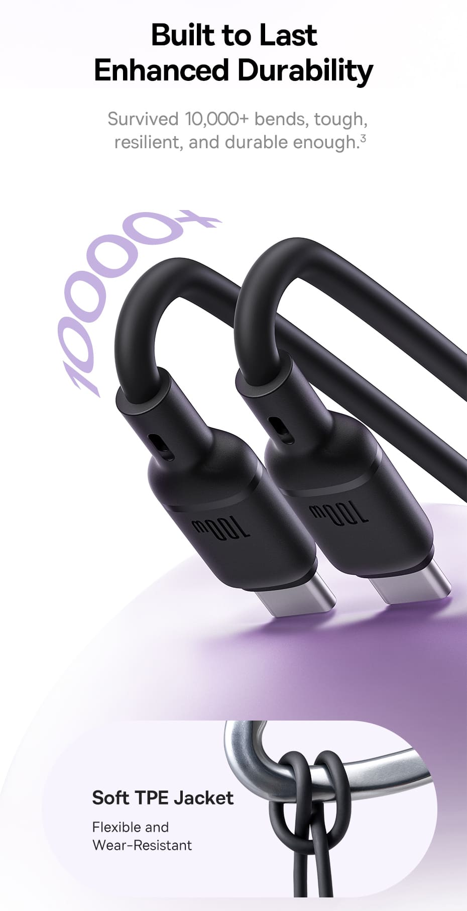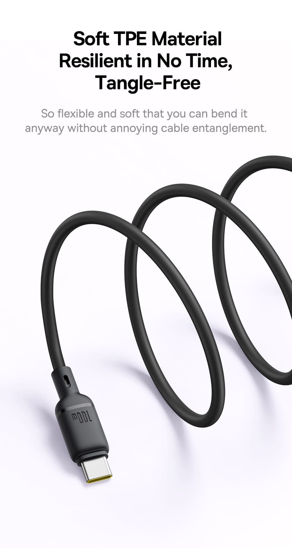 💪 Chất Liệu Mềm Dẻo, Bền Bỉ Vượt Trội: Vỏ cáp được làm từ vật liệu TPE cao cấp, cho cảm giác mềm mại, linh hoạt và có khả năng chống rối hiệu quả. Dù mềm mại, cáp vẫn vượt qua hàng ngàn lần thử nghiệm uốn cong, đảm bảo độ bền cao.