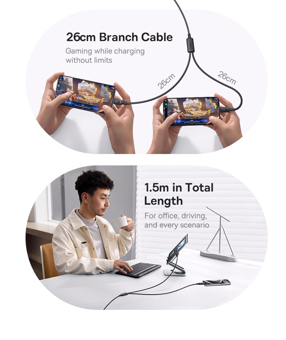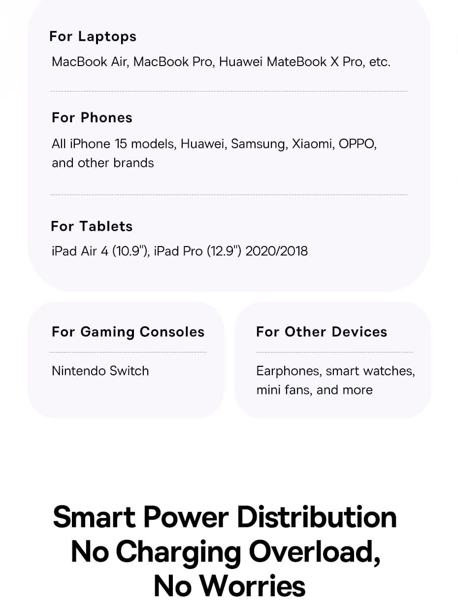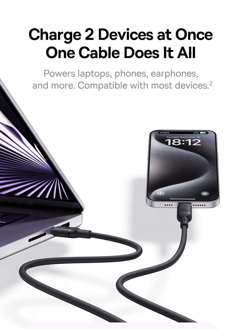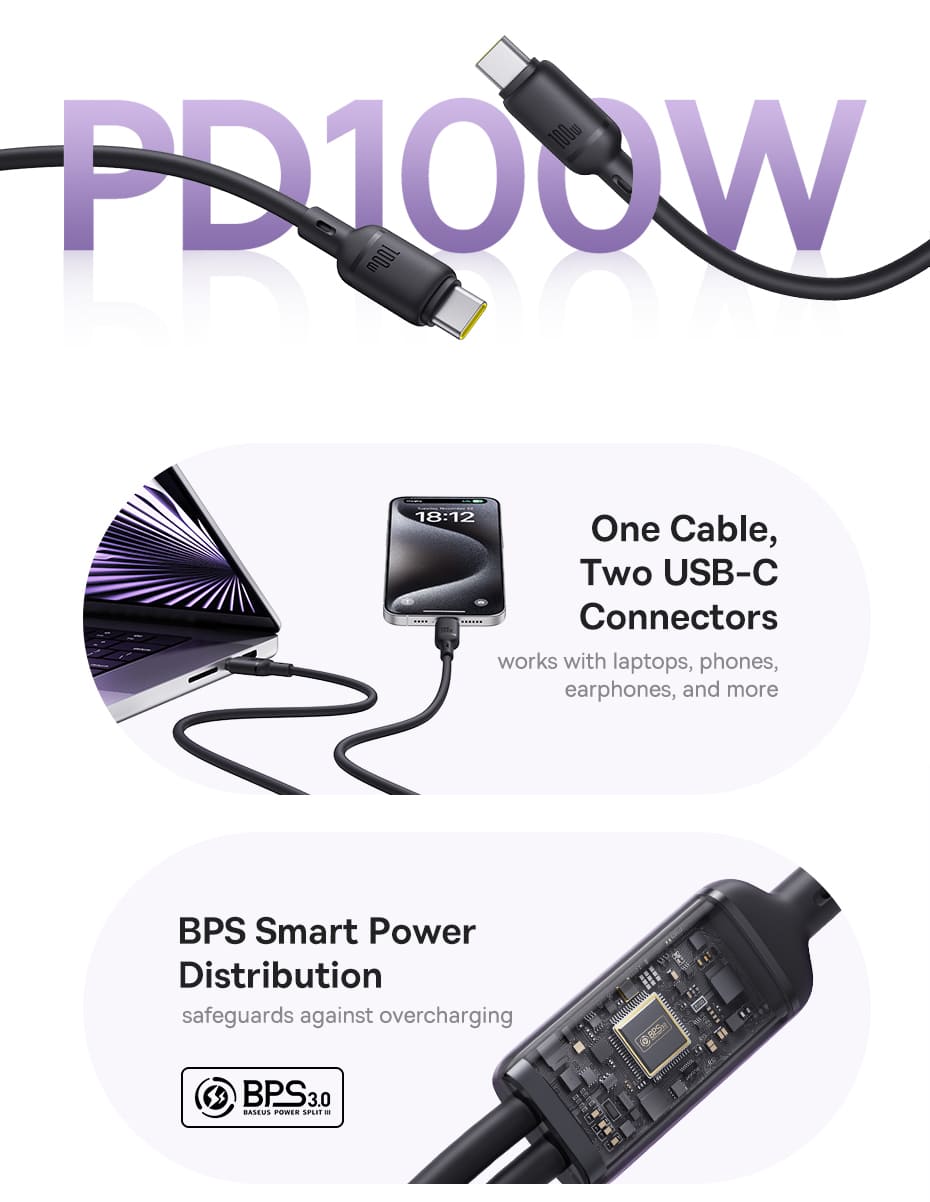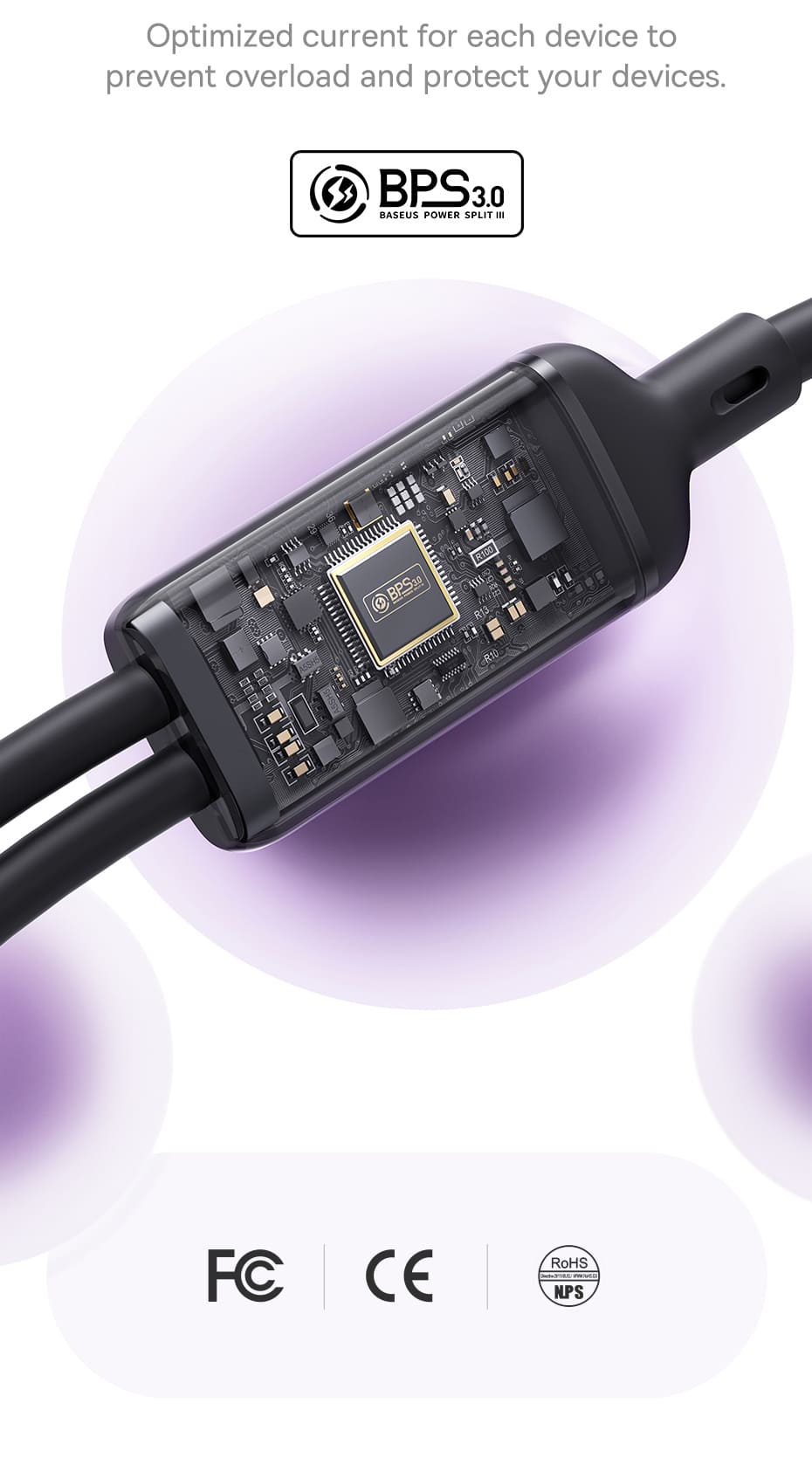 ⚡️ Sạc Nhanh Thông Minh, Phân Bổ Công Suất Lớn: Hỗ trợ tổng công suất sạc cực lớn. Chip BPS (Baseus Power Split) thông minh sẽ tự động phân bổ dòng điện một cách hợp lý và an toàn cho cả hai thiết bị, ưu tiên năng lượng cho thiết bị cần nhiều hơn như laptop để đảm bảo hiệu suất tối ưu.