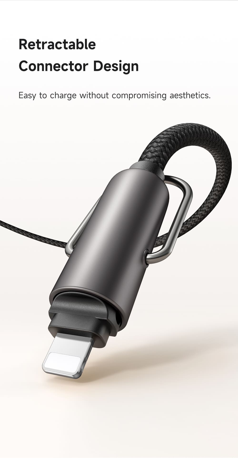 💪 Bền Bỉ & Cao Cấp Trong Từng Chi Tiết: Đầu cắm Ln có thể rút gọn vào vỏ hợp kim nhôm, bảo vệ tối đa khỏi va đập và bụi bẩn, tăng cường tuổi thọ. Toàn bộ dây được bọc dù bện chắc chắn, chống rối, chống đứt gãy và thân thiện với da, đảm bảo độ bền dài lâu.