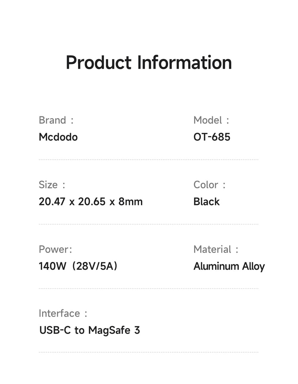 | Tên | Đầu Chuyển Đổi Mcdodo 140W Type-C to MagSafe 3 Portable Adapter |