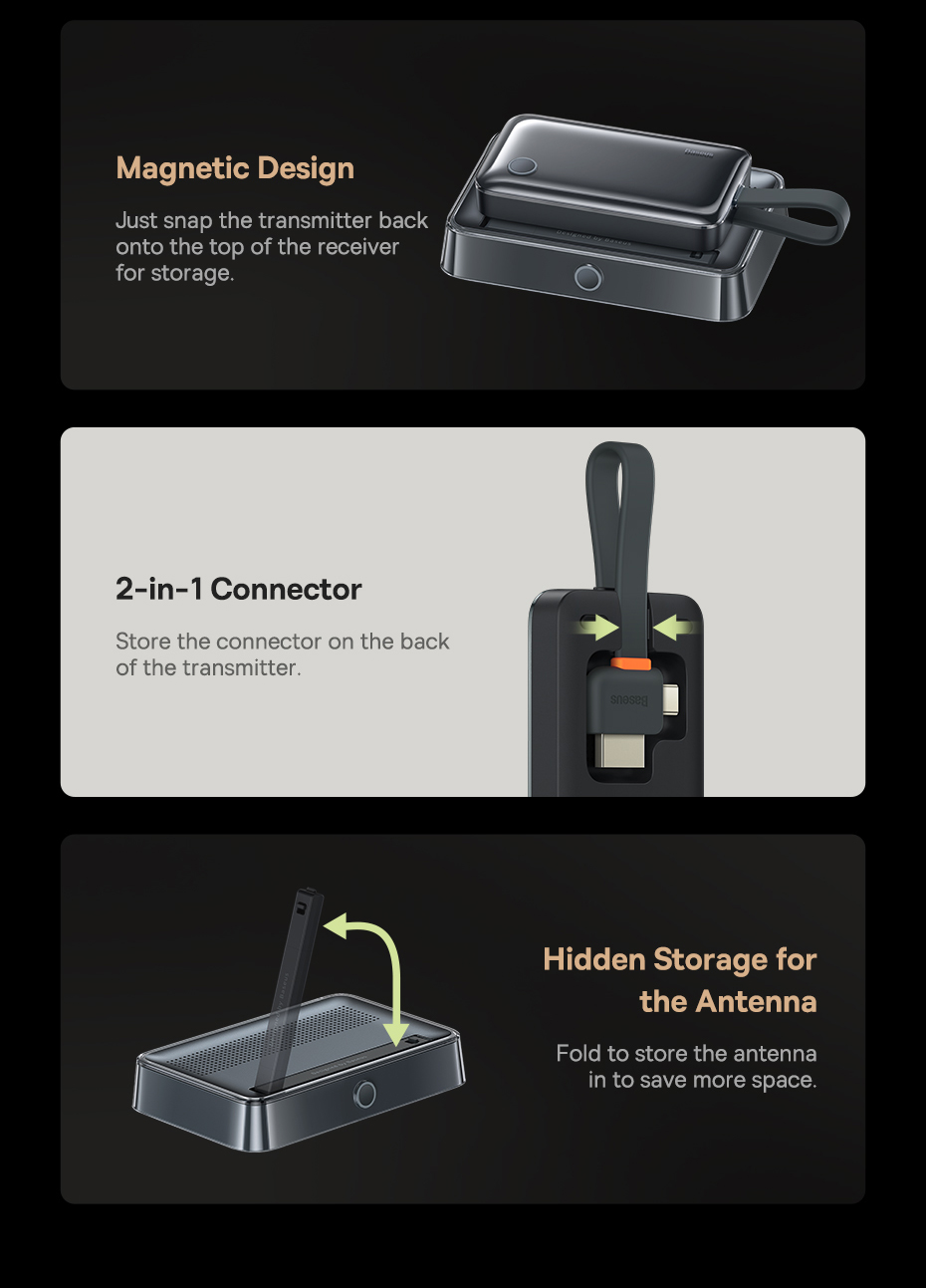 ✨ THIẾT KẾ NAM CHÂM & ANTEN GẤP GỌN: Siêu tiện lợi khi cất giữ và di chuyển. Đầu phát có thể hít nam châm gọn gàng lên thân đầu thu. Anten trên đầu thu cũng có thể gấp gọn lại, tiết kiệm không gian tối đa.